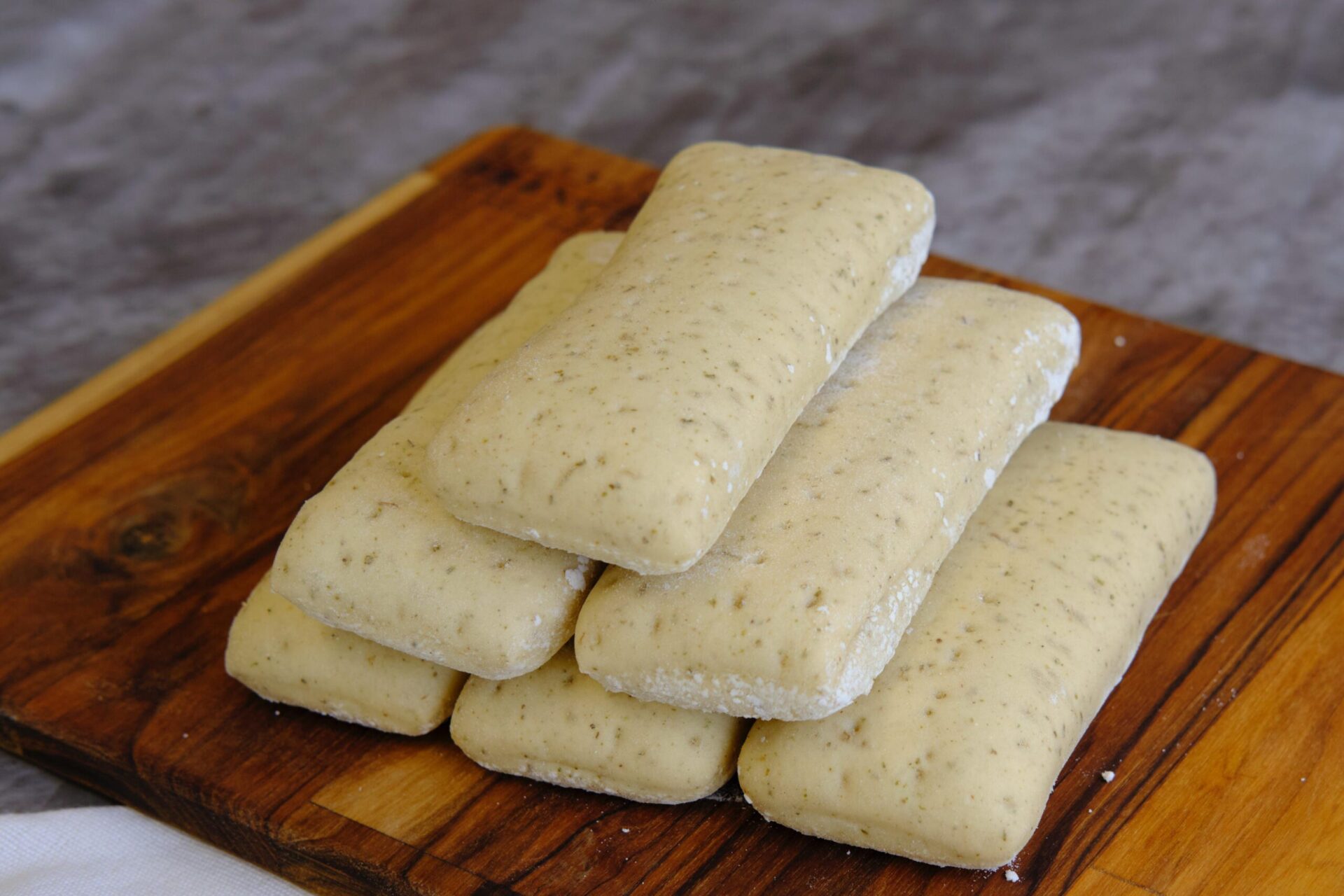 Pan artesanal blanco rectangular tamaño personal con finas hierbas. Pan suave, sin corteza, ideal para sándwiches aplanchados o fríos.
